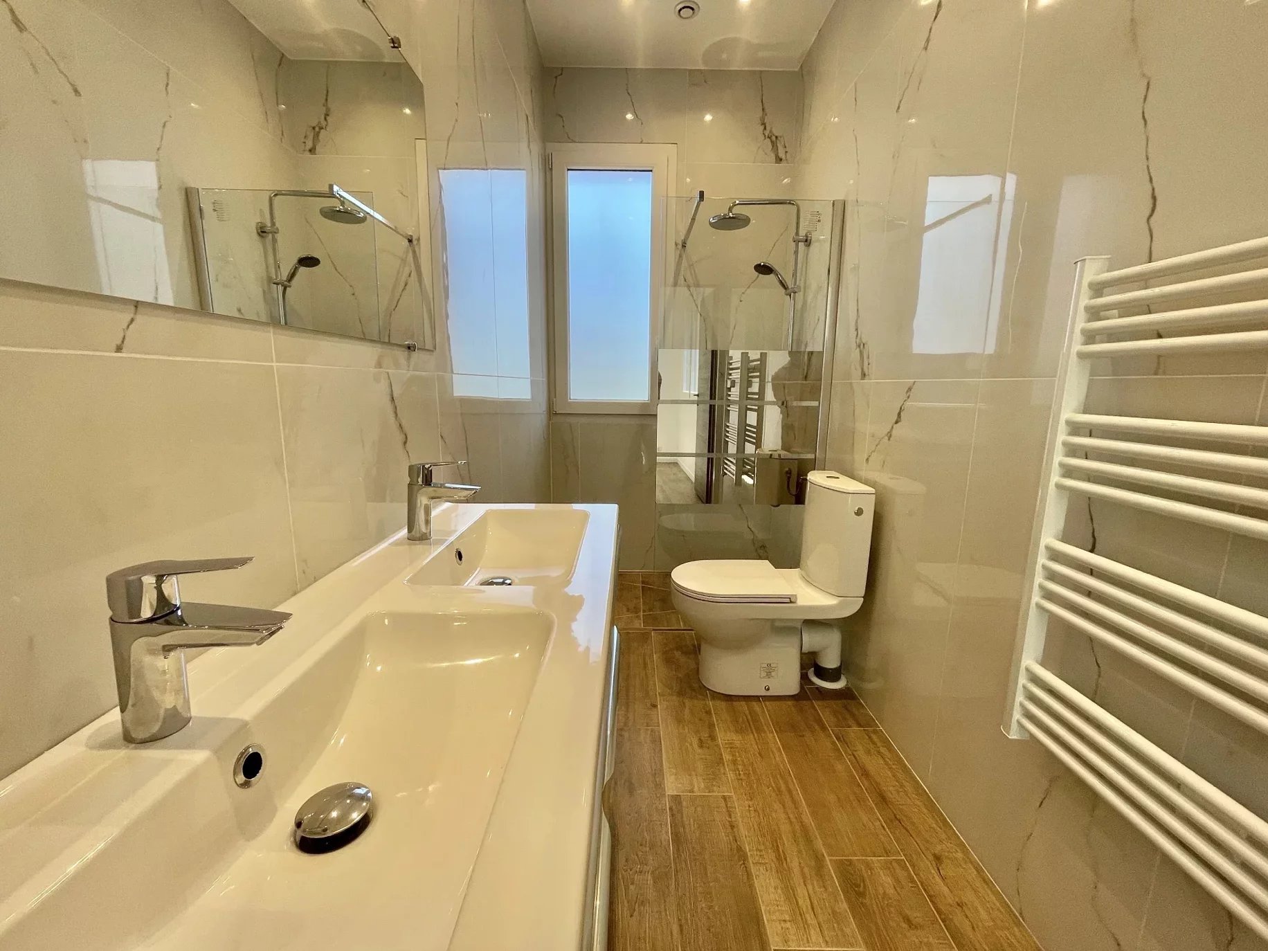 • Un vaste appartement de trois pièces comprenant une entrée, un séjour, deux chambres en suite et un WC indépendant.