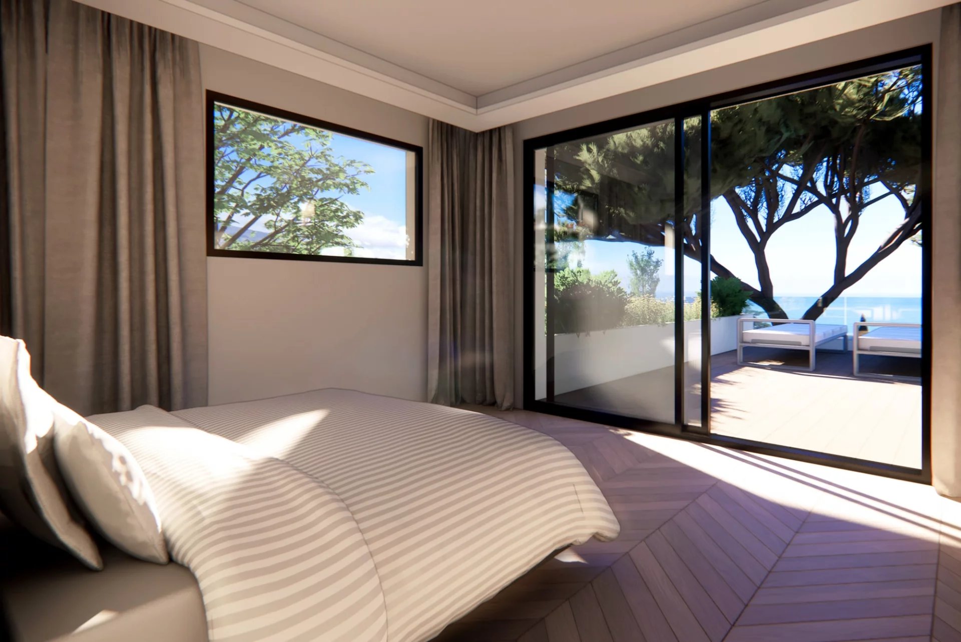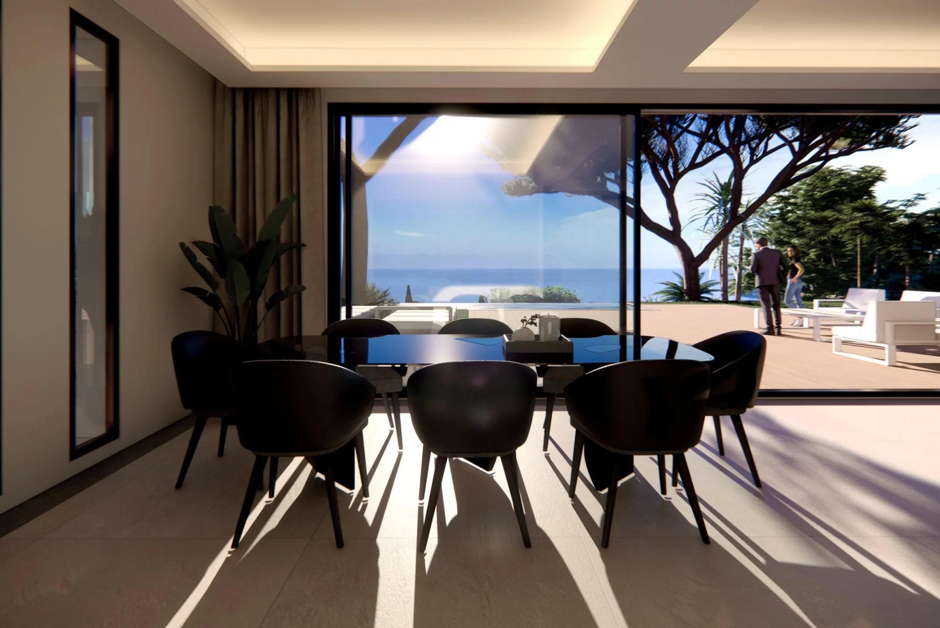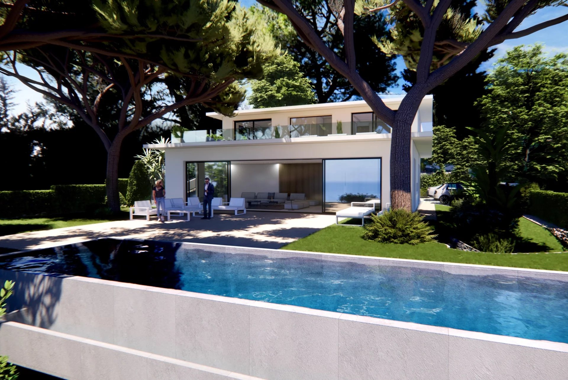 In einer ruhigen und sehr gefragten Gegend von Roquebrune-Cap-Martin, in einem kleinen privaten Anwesen mit nur fünfzehn Villen, liegt dieses moderne Anwesen von ca. 264 m² mit Panoramablick auf das Meer und einem Infinity-Pool.